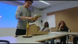 - In project „Babelbam“ (2013) I created a hammer-triggered spring mechanism that self assembled in random ways and exploded into triangular pieces.